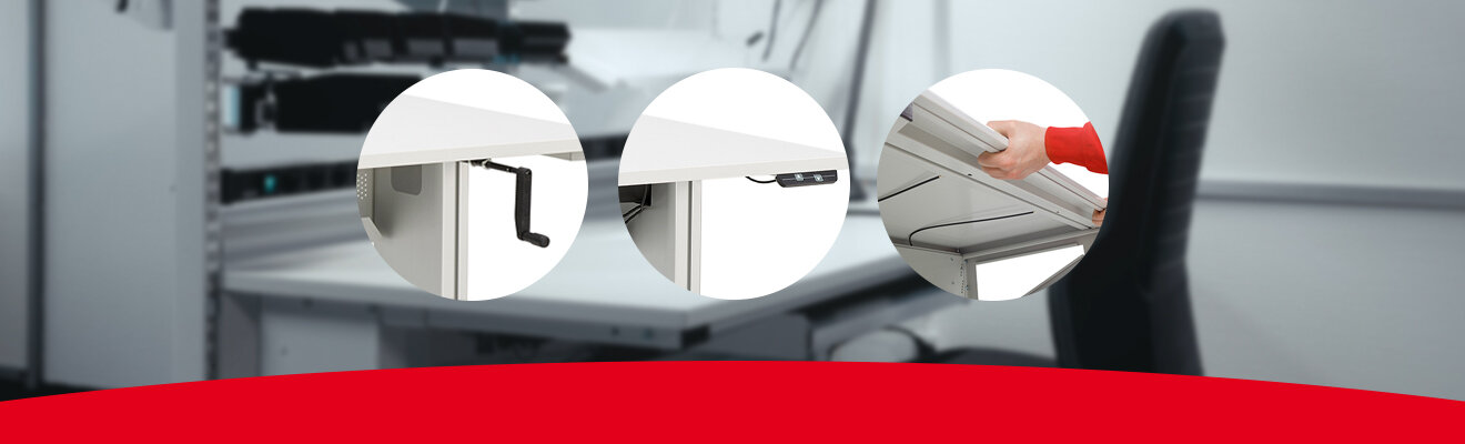 Korkeutta voi säätää sähköisesti (sähköpöytä) tai manuaalisesti (kampi- ja ruuvisäätöiset versiot). Ruuvisäätöinen teollisuustyöpöytä sopii parhaiten, kun korkeudensäätöä tarvitaan vain harvoin.