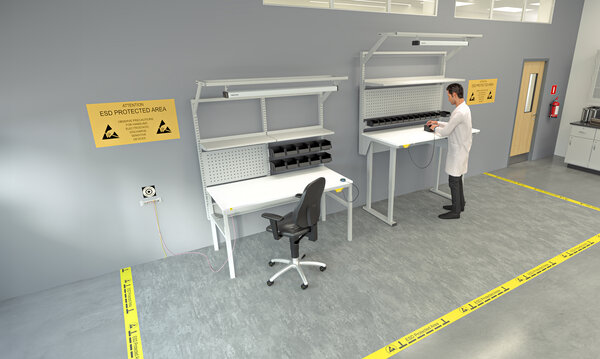 Kaikki kalusteet, jotka ovat lähellä herkkiä komponentteja, kuten työpöydät, vaunut, tuolit ja varusteet (hyllyt, laatikot, bin-lokerot). Osa työpöydistä maadoittuu ESD-lattian kautta; osa tarvitsee johdotuksen CPG:hen — muista säännöllinen testaaminen.