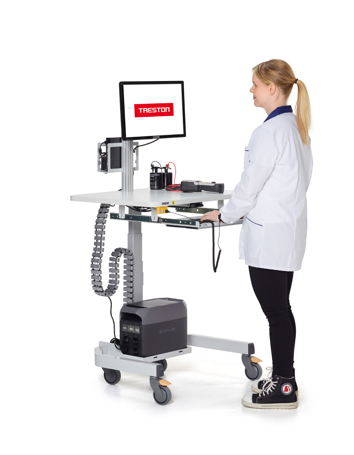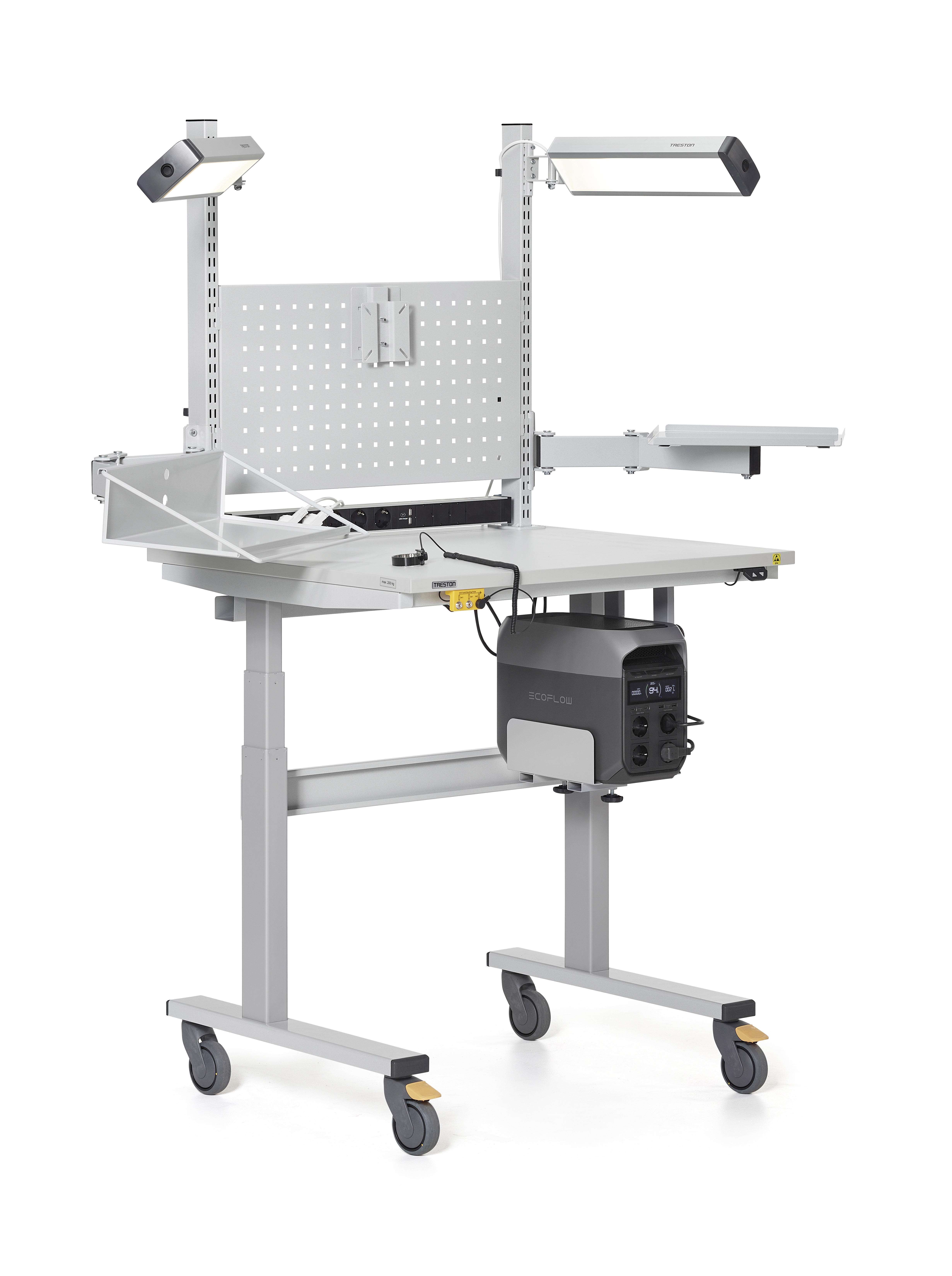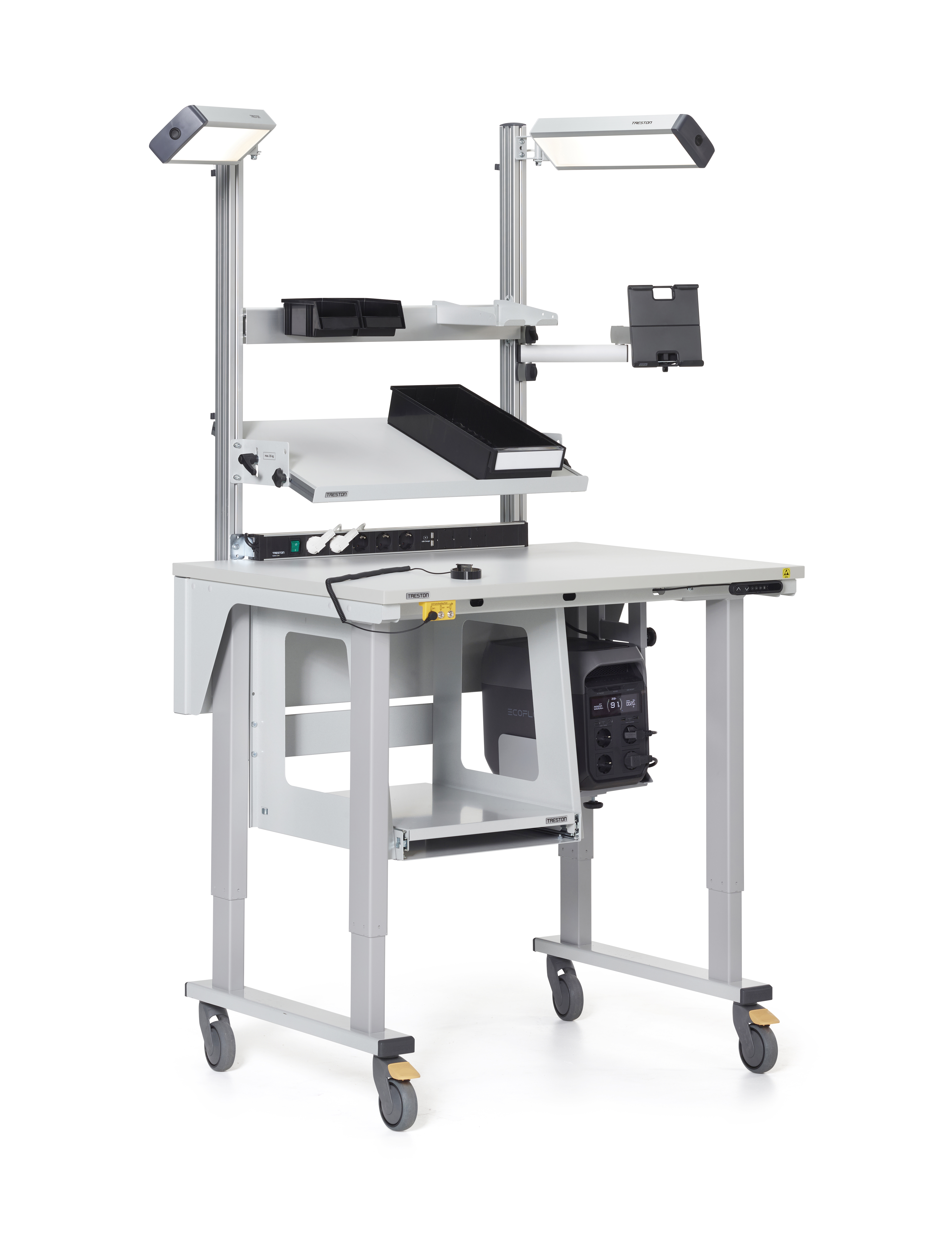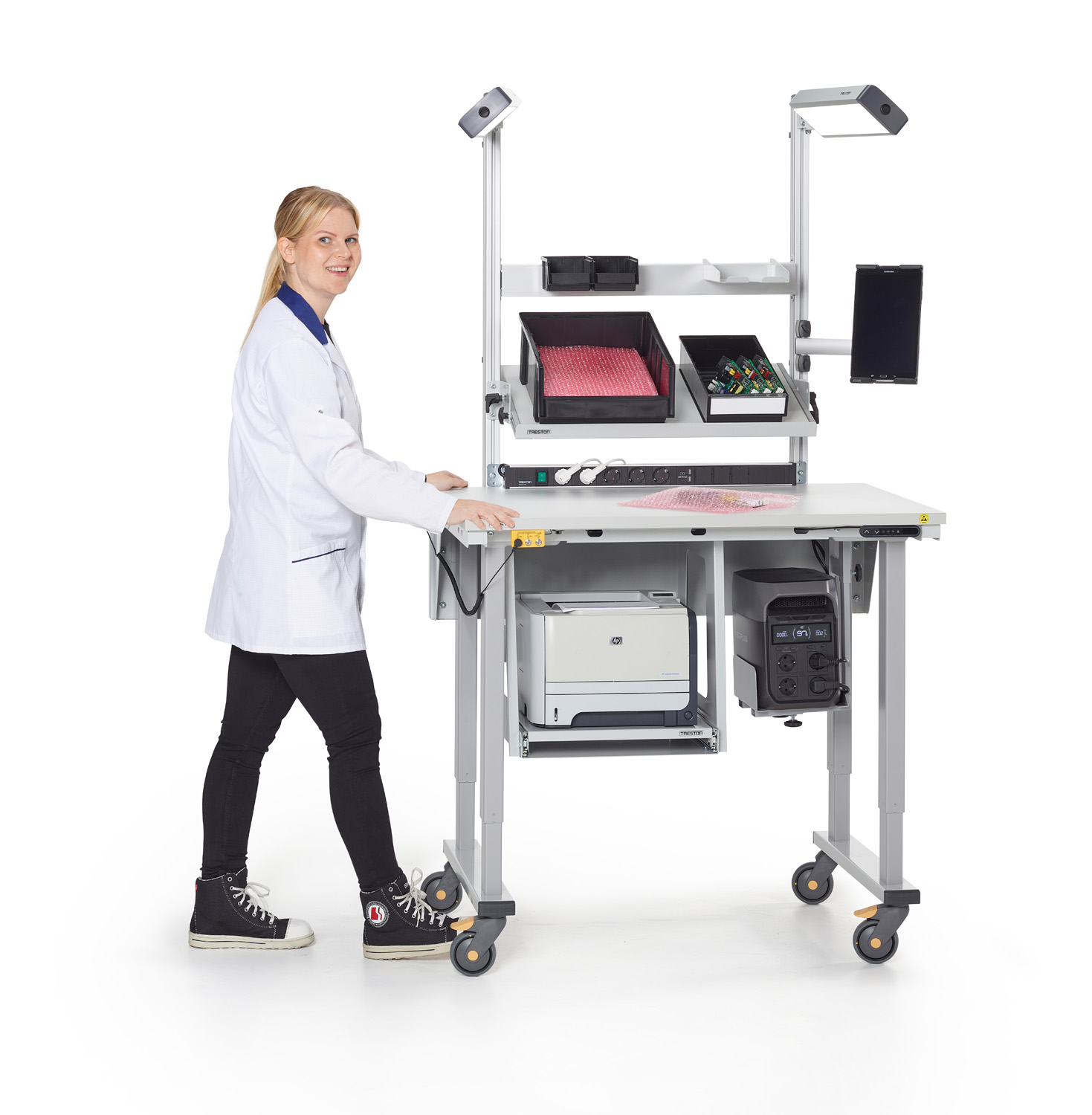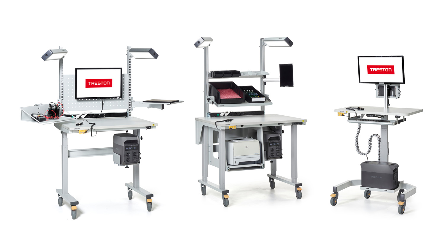 Treston PowerX -akkukäyttöinen liikuteltava työpistesarja on suunniteltu joustavaan työskentelyyn teollisuus-, logistiikka-, laboratorio- ja ESD-suojatuissa ympäristöissä. Nämä akkukäyttöiset liikuteltavat työpisteet mahdollistavat joustavan työskentelyn missä tahansa yrityksen tiloissa. Virtayksikkö tarjoaa luotettavan virransyötön tietokoneille, viivakoodinlukijoille, ja muille välttämättömille laitteille, jolloin kiinteän pistorasian läheisyys ei ole tarpeen.